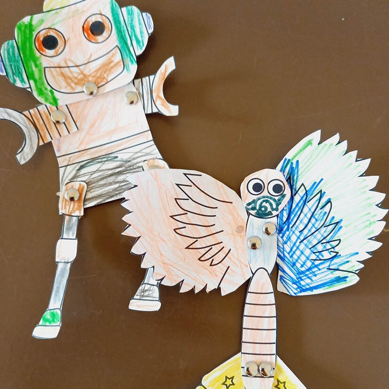 De kinderen maken hun eigen bewegende figuur met splitpennen, knopen en touw. Met grote verwondering en plezier kijken ze hoe hun pop tot leven komt zodra ze eraan trekken. Eerst verkennen we samen oud speelgoed en hoe het werkte. Daarna is het tijd voor hun eigen ontwerp!